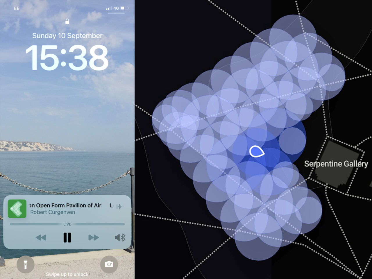 We undertook local fieldwork in two locations on the same week-end (08-10/09/2023). Both were sites for Robert Curgenven Open Form Pavilion of Air project, which uses the Echoes geolocation audio app to fill demarcated locations with a pattern of tones. Movement within the chosen area triggers different sounds within the user’s headphones. Emmanuelle, Will and his son Kip walked in Kensington Gardens near the Serpentine Gallery and Robert walked in a location in Cornwall. We set a deadline for the completion of traces a few weeks after that. Our prompts, chosen for optional orientation in our walks, were the following: